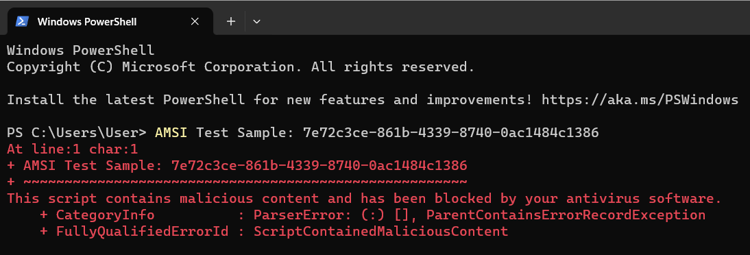 PowerShell에서 AMSI Test Script를 실행해보면 아래 화면 처럼 Malicious Content로 Block이 되었다는 오류가 발생한다.