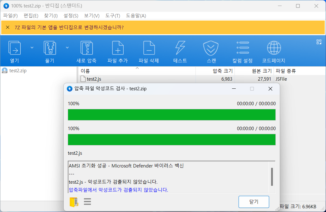 AMSI를 사용하는 예시로 아래는 반디집에서 AMSI를 통해 압축 파일 내부의 Malware를 스캔할 수 있다.