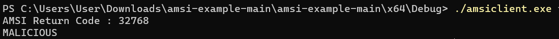 AMSI Scan으로 인해 Return 값이 32768로 나오게 되고 해당 Return 값은 amsi.h에 정의된 AMSI_RESULT에서 AMSI_RESULT_DETECTED로 정의되어 있어 MALICIOUS로 출력이 된다.