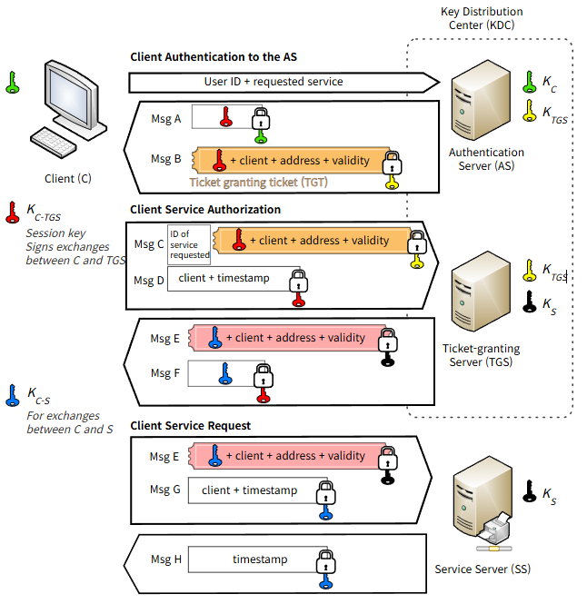 - 인증 서비스를 제공하고 티켓 및 임시 세션 키를 제공하는 신뢰할 수 있는 제 3자의 역할을 하는 서버, AS(Authentication Server)와 TGS(Ticket Granting Server)로 구성