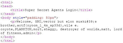 return render_template("login.html", msg="hey! close, but no bananananananananana!!!! (there are many secret agents of course)")