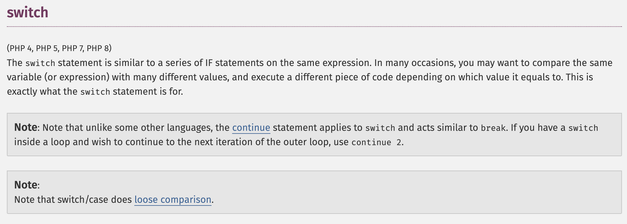 하지만 switch/case 문에서는 아래 처럼 loose comparision을 사용한다고 되어있다.